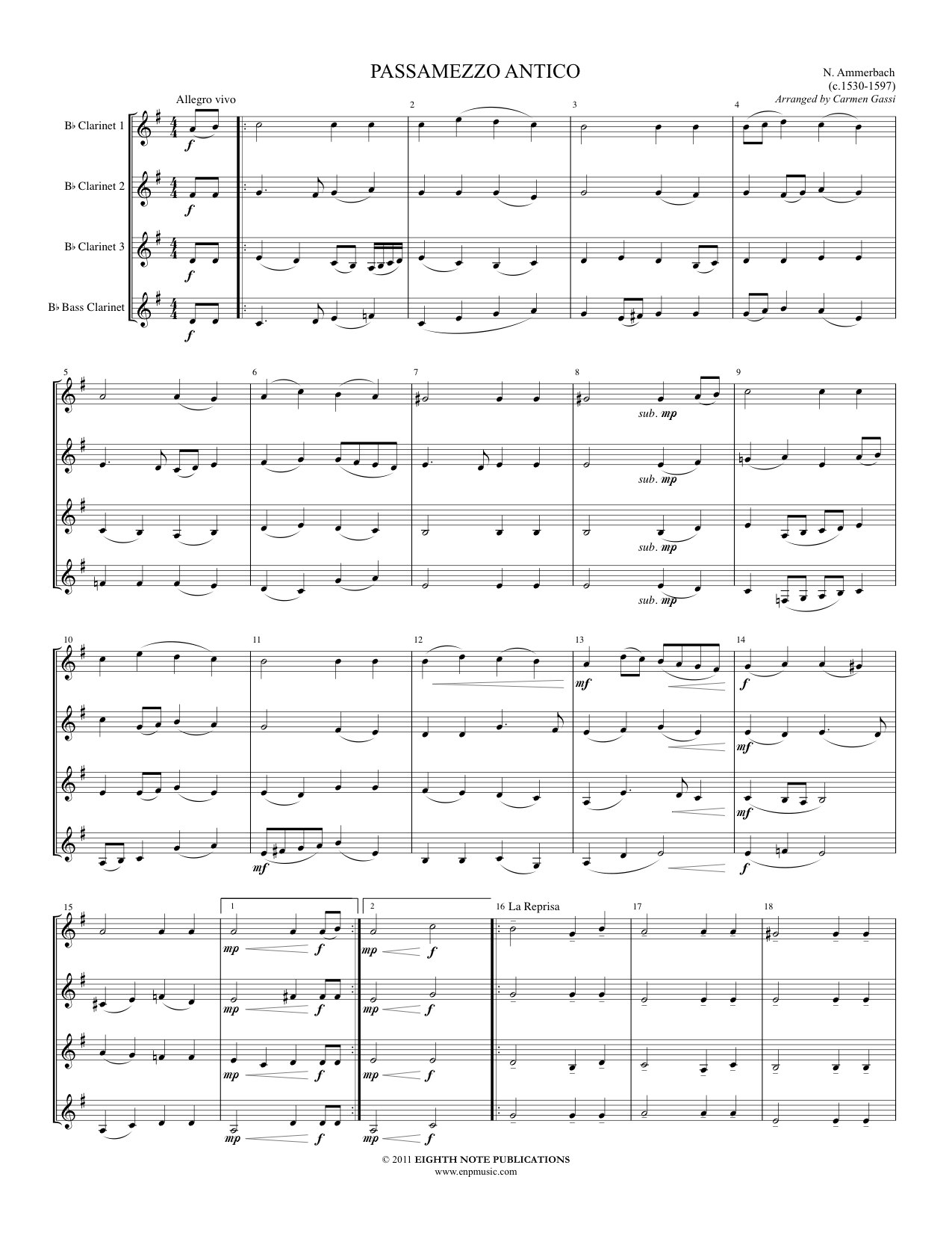 Elias Nikolaus Ammerbach was a German organist and arranger of organ music from the Renaissance. The Passamezzo Antico refers to a chord progression that was popular during the Renaissance and is still in use today. Your clarinet quartet will enjoy this moderately challenging, but very approachable, interpretation of a set of dances originally written for the Renaissance organ.