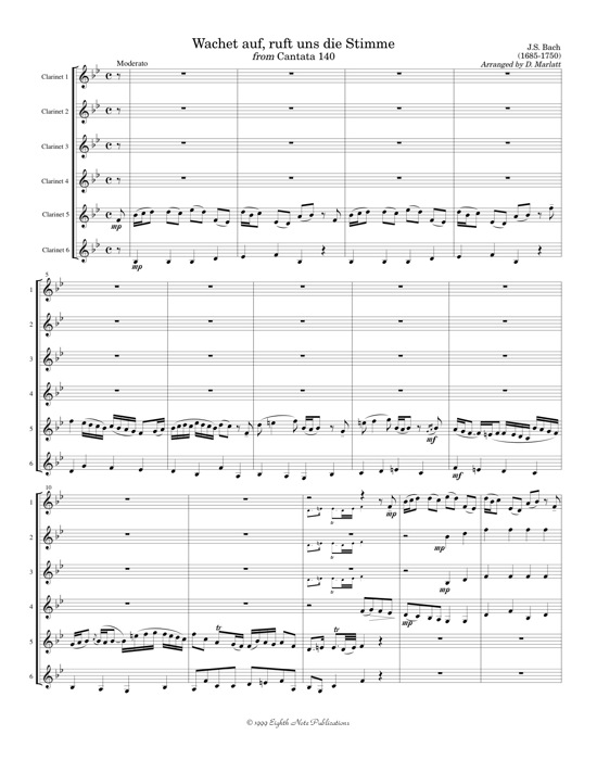 J.S. Bach's Wachet Auf has been arranged almost as many times as Pachelbel's Canon. What makes this version different is that the melody appears in all voices rather than the standard solo with accompaniment. It has been scored for 6 clarinets and none of the parts is too difficult.