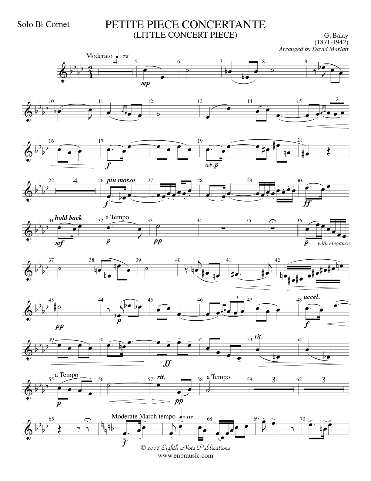 This is a standard piece in solo trumpet repertoire that is used on countless festivals and competitions. The beautiful opening weaves its way through several key centers leading to the March where fast fingers and light articulations come into play. A great piece to show the capabilities of the cornet (or trumpet). The original was scored for cornet and piano and this arrangement for band allows for a wider range of timbres in the accompaniment.