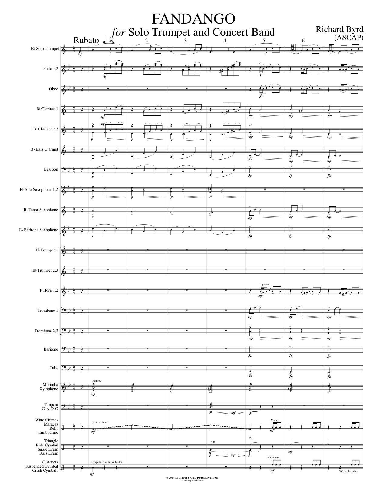 Fandango is based on a traditional fandango, a lively Spanish or Portuguese couples dance in triple meter typically based on the recurring descending chord progression i VII VI V. The couples dance is reflected in the spirited interplay between the soloist and band that immediately follow the emotive rubato introduction.