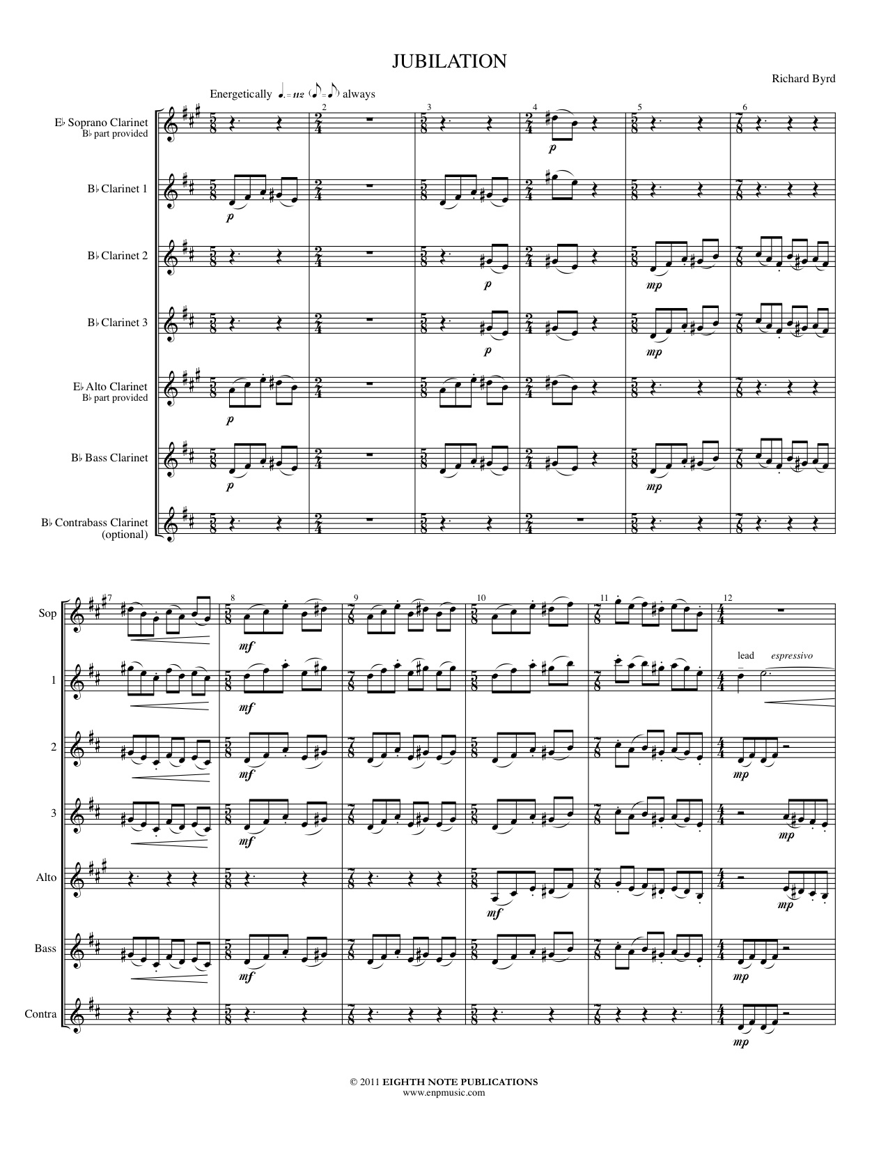 Jubilation is an expansion on Rich Bird s original work Euphoric Dance for clarinet quartet. Melodically it exudes a lydian-flavor throughout the piece and builds to a climactic and glorious original hymn-like chorale before closing with a spirited triumphant coda. Great parts for all players. This is scored for a clarinet choir consisting of soprano, 3 mezzo soprano, alto, bass and optional contra bass.