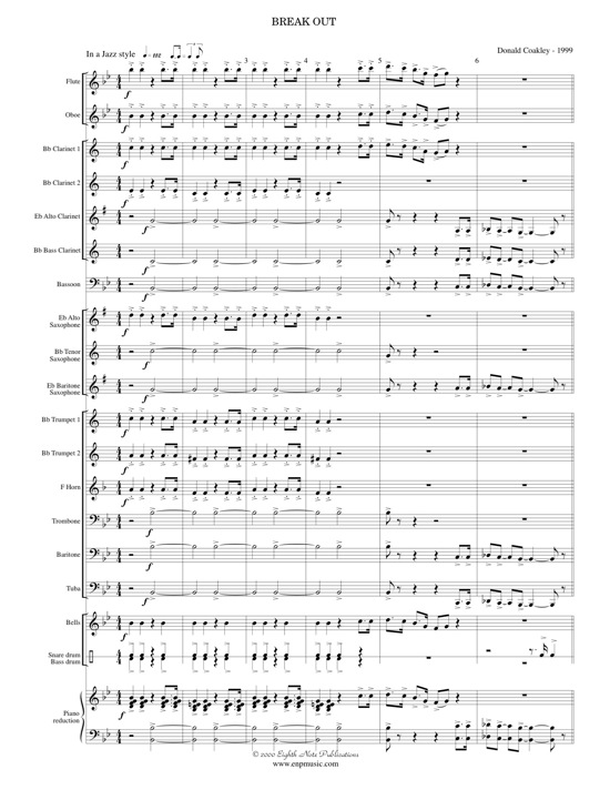 Break Out is conceived in a Boogie Woogie style. This fun piece provides the opportunity to have young bands and . There are short feature solos for trumpet, alto sax and clarinet. This short piece would make a great encore or closer to a concert.