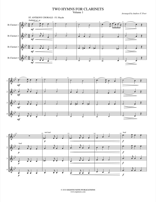 Each hymn was conceived as a four-part chorale to be used as both a warm-up selection and a piece that could be used to develop lyrical performance skills. Both hymns are personal favorites of the arranger, one from the orchestral canon and the other from the sacred hymnal - St. Anthony's Chorale and My Father's World.