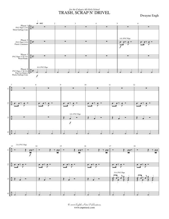 Trash, Scrap N Drivel was written with the intent of creating a fun piece for students to play that a non-musician could easily teach to an eighth grade class with little musical experience and that allowed many dramatic possibilities in the blocking and staging of the piece. It is scored for an ensemble of at least 8 players.