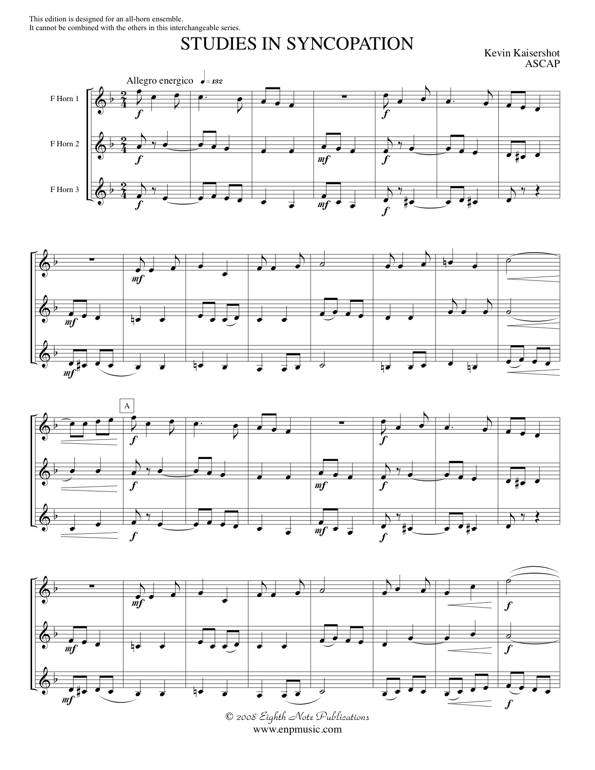 This piece was designed to teach various forms of syncopation in an ensemble setting. While much of what is presented is pretty straightforward and somewhat common in terms of syncopated figures, there is still an element of tongue-in-cheek to this work. This STAND ALONE version cannot be used in combination with the others in the series. It has been transposed to best suit the range of horn players at this level.