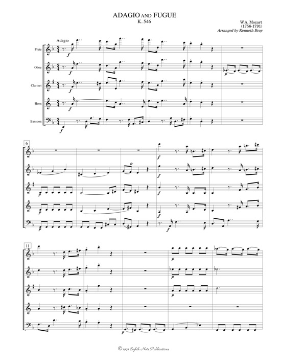 Kenneth Bray has taken a Mozart masterpiece and brilliantly adapted it for woodwind quintet. This is a challenging work that is full of the flair and colour that is so typically Mozart. The Adagio opening has the melodic material passing all through the ensemble and Fugue, marked Allegro, demonstrates the technical abilities of the woodwinds.