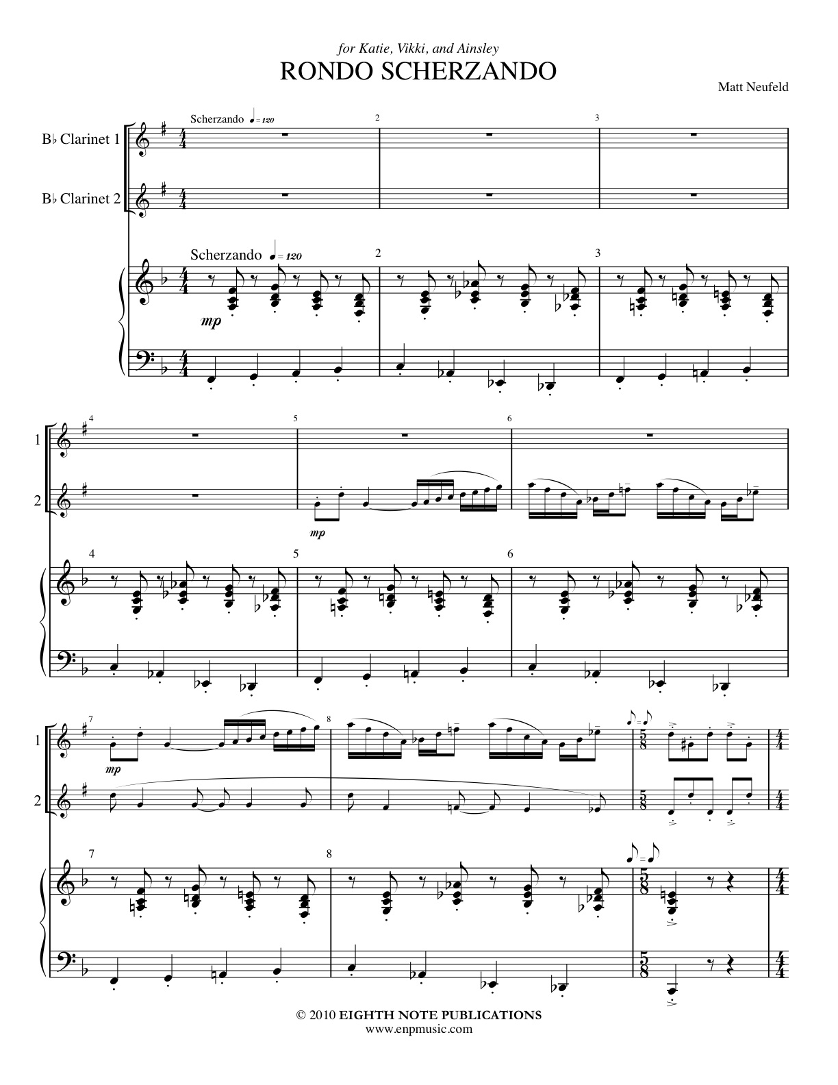 Rondo Scherzando is a fun, lively piece that will have your audience cheering for more! This clarinet duet features fast, rhythmic lines, interesting meter shifts, and exciting modern harmonies. This piece is excellent for recitals, school performances, or anywhere two clarinetists come together.