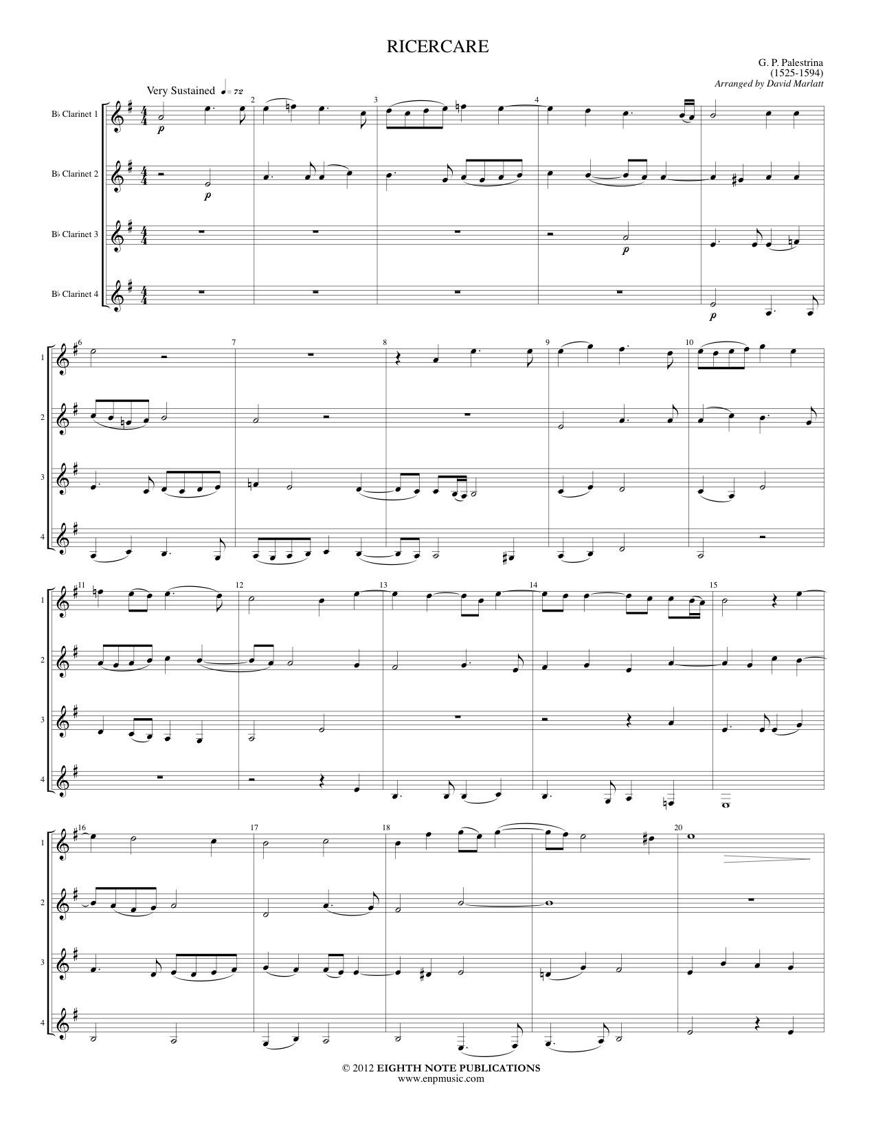 A ricercare is defined as an elaborate contrapuntal instrumental composition in a fugal or canonic style. This particular selection for four clarinets fits that description exactly. The musical lines flow from part to part in this haunting slow work. This is a great piece to develop intonation, cohesiveness, and ensemble playing. This would also make a great warmup for an ensemble.
