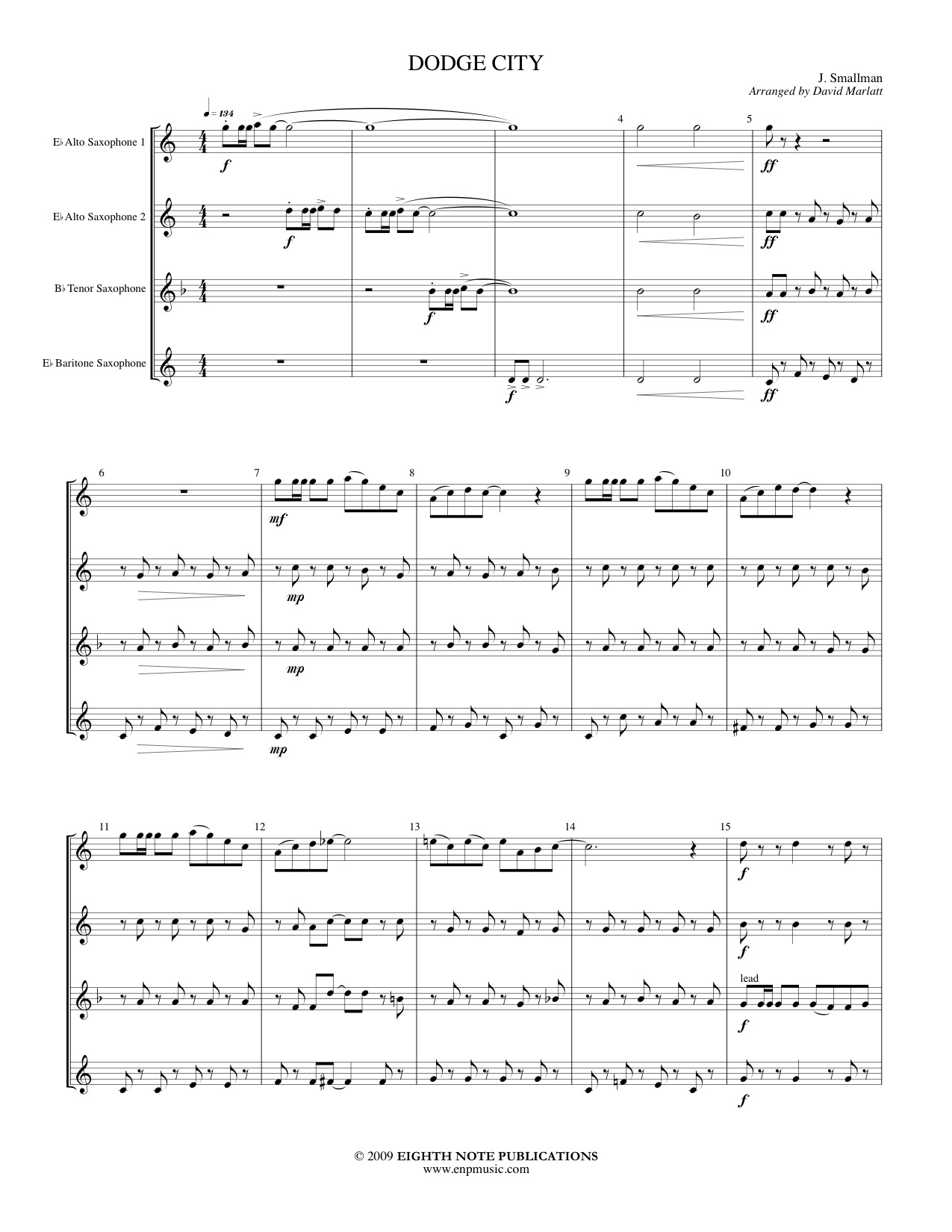 Dodge City is an exuberant piece designed to take you back to the time of the old west. As the title implies, this is a work that will bring to mind stagecoaches and sagebrush, cowboys and cactus, sheriffs and showdowns. Quick and lighthearted, the opening and closing sections frame a lyric middle section. Dodge City has captured the atmosphere of a bustling city from the old west and is sure to captivate performers and audiences alike.