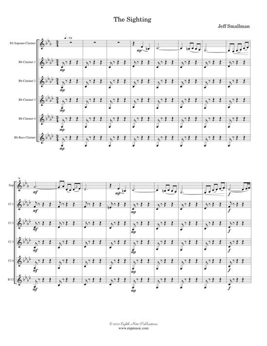 The Sighting was written for a short film produced in 1995 in Vancouver but, due to time constraints, was never included in the finished film. This work is the middle in a set of three movements (the first being The Search and the third The Encounter). This piece, like the others, is for a clarinet choir consisting of 1 e-flat clarinet, 4 b-flat clarinets and 1 bass clarinet.