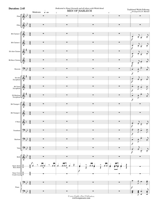 Men of Harlech is a folksong from Wales. It is a stirring and bold march that shows off every section in the band. There are percussion interjections, trumpet fanfares and large dynamic changes. This is a great band tune that develops many important ensemble playing skills. This will prove to be a popular selection with both audiences and members of the band.